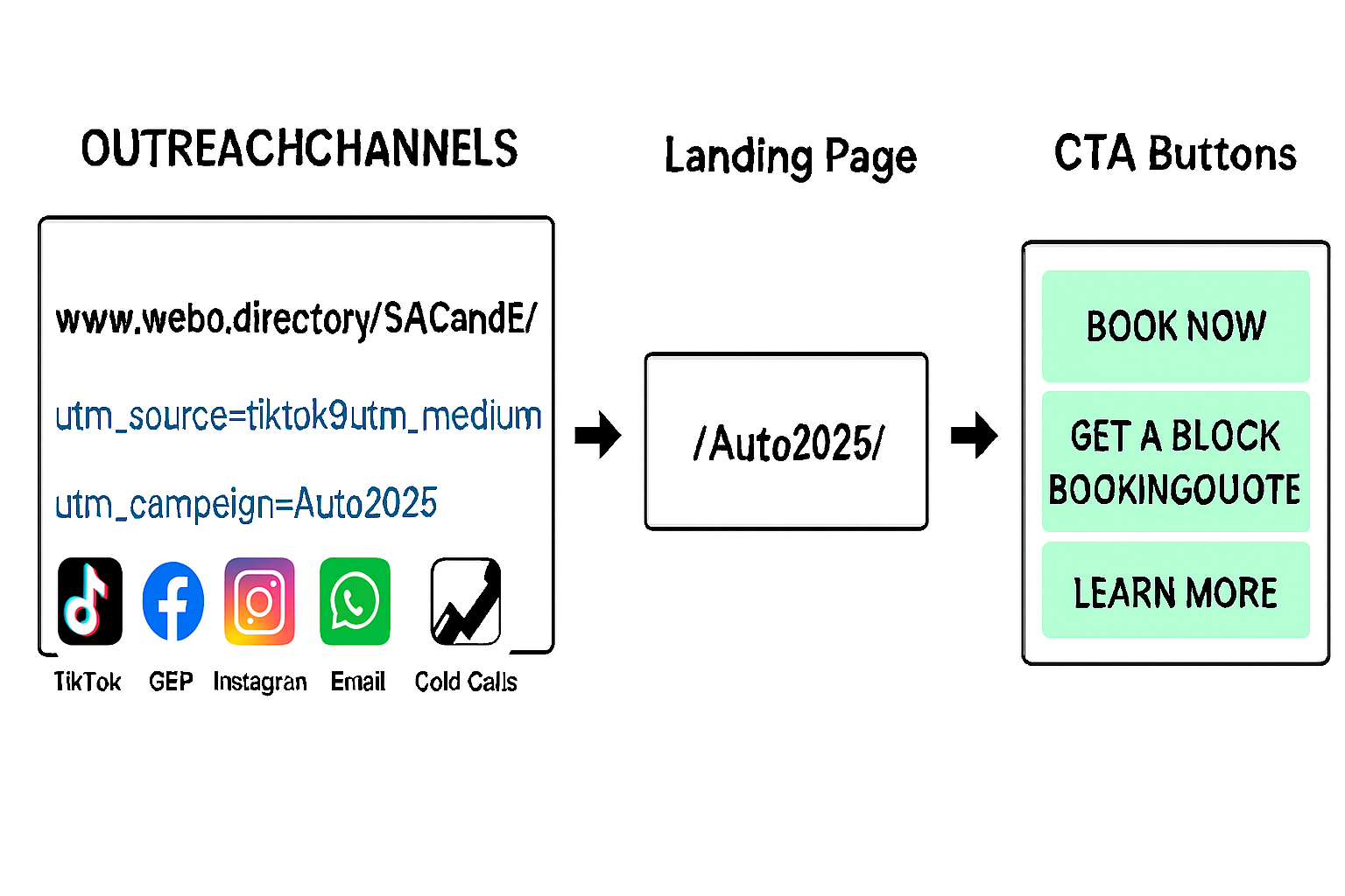 UTM tracking uses tagged URLs to identify which outreach channel brought a visitor to a website. SACandE used UTM tracking to measure the effectiveness of TikTok, WhatsApp, Email, Cold Calls, and other platforms in driving traffic and conversions for the 2025 Auto Conference.