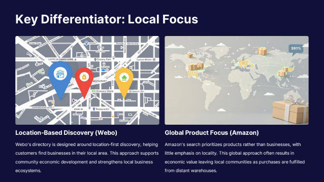 About The Webo Directory & Site BuilderEmpowering Local Businesses in a Global WorldIn a world where global reach often overshadows local needs, Webo Directory stands out as a beacon for neighborhood businesses seeking meaningful visibility and sustained growth. Unlike massive global marketplaces such as Amazon, which prioritize worldwide product distribution and centralized customer control, Webo is dedicated to empowering local businesses by connecting them directly with their community. Do you wish to explore the detail which sets us apart? Perhaps you are interested in being trained to be a Webo Agency Owner? Perhaps you want to explore the Benefits of Site Ownership or Webo Marketing? to download an Eighty-Five Page Detailed Account of why we are who be are, a Best In Class Directory and Site Builder. The Webo vs. Amazon AnalogyAmazon, with its vast global reach, connects sellers to an international customer base but often at the expense of the sellers' control over customer relationships and brand identity. Products compete in a massive marketplace where visibility is dictated by complex algorithms and high advertising costs. In contrast, Webo offers a refreshing alternative. Webo provides local businesses with the tools they need to be discovered within their neighborhoods. By integrating with Google Local Search, Webo ensures that neighborhood service providers, retailers, and professionals are easily found by nearby customers, preserving their unique identity and fostering direct relationships. Motivation for Local Neighbourhood MarketingLocal neighborhood marketing is crucial in today's digital landscape. With advancements in AI and global search technologies, businesses need to ensure they are not lost in the sea of international competitors. Webo's approach boosts the ranking of local businesses on search engines and AI search queries by focusing on location-based discovery. By leveraging Webo's directory, businesses can appear in the coveted "Google Local Search Three Pack," significantly increasing their visibility to potential customers actively searching for relevant products and services in their area. This targeted visibility helps retain economic value within the community, fostering local economic development. Advantages of the Webo Local Marketing ApproachWebo's local marketing approach provides numerous advantages: - Targeted Visibility: Businesses are discovered by customers in their immediate vicinity, increasing foot traffic and local engagement.